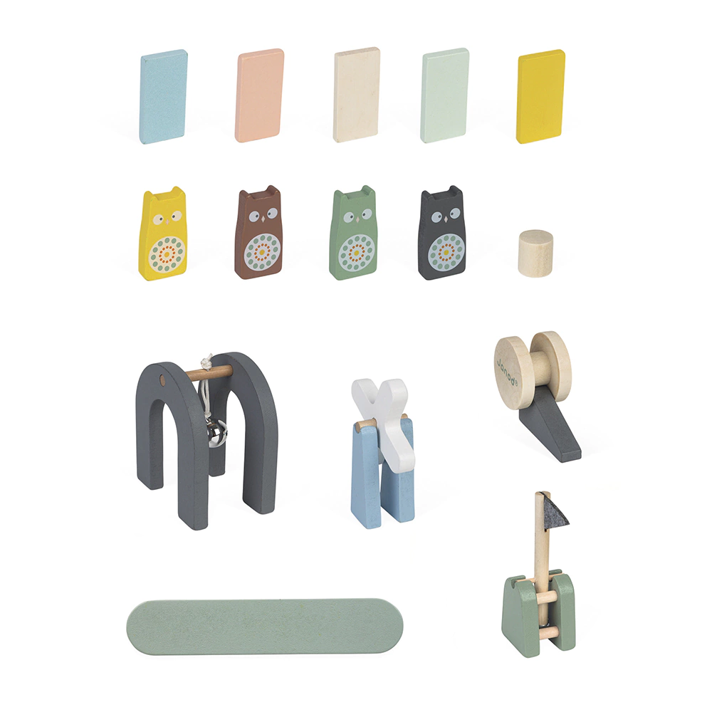 Dominó é um jogo clássico e atemporal. Descubra o jogo de dominó Sweet Cocoon: composto por 100 peças de madeira e com suas cores modernas, este jogo permitirá que seu filho a partir de 3 anos de idade crie cursos repletos de obstáculos e desenvolva sua imaginação. Um número infinito de combinações é possível! Studs, uma ponte, um moinho, uma bandeira, um sino, uma inclinação e um carretel estão incluídos para animar o percurso. Este jogo promete bons momentos de partilha e risadas com a família ou amigos, é também educativo: ideal para explorar a relação de causa e efeito, usar dominó para destacar essa noção e mostrar à criança que qualquer ação tem consequências. Será preciso paciência e meticulosidade para organizar todos os quartos ... e derrubá-los todos!.